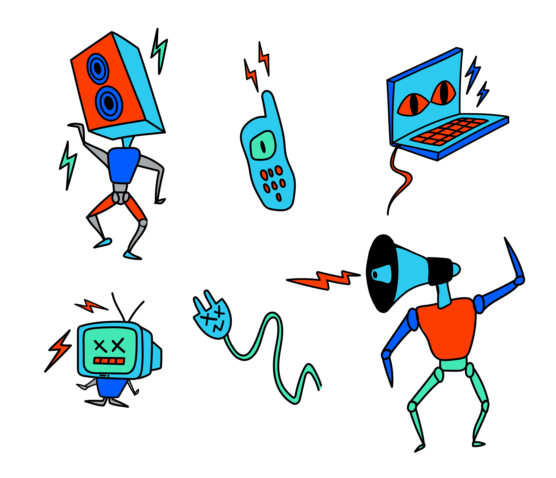 Ilustración de personajes, diseño de logo y gráficas para campaña de reciclaje de E-waste.